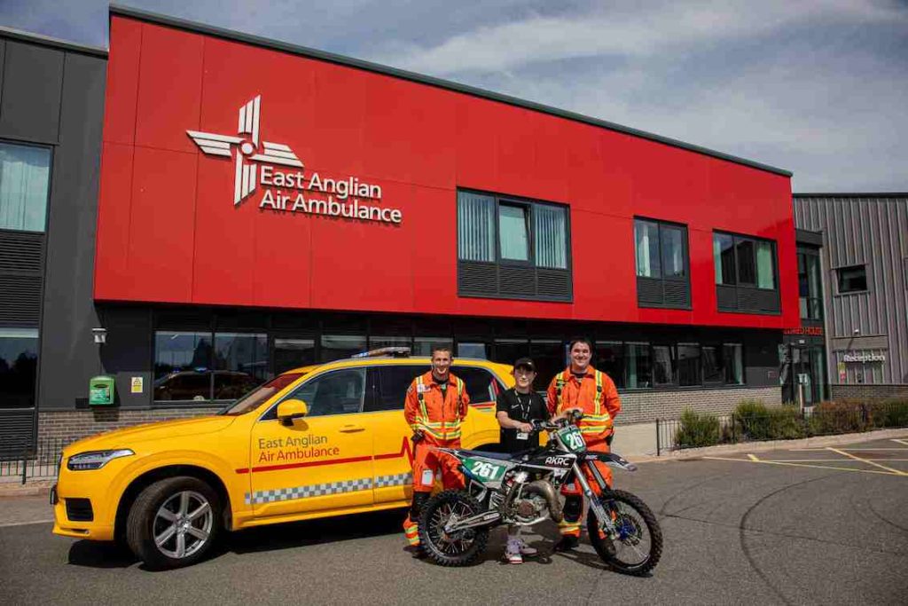 One of those was 13-year-old Jaden from Norwich who suffered a significant leg injury in a motocross accident in Norfolk. The on-site medical team attended quickly, the emergency services were called and the East Anglian Air Ambulance Anglia One (Norwich) crew were tasked by helicopter to bring urgent care to Jaden directly at the scene. The ambulance service was able to control Jaden’s bleeding, and the East Anglian Air Ambulance crew administered advanced medication before flying Jaden to the Norfolk and Norwich Hospital, where he needed surgery.