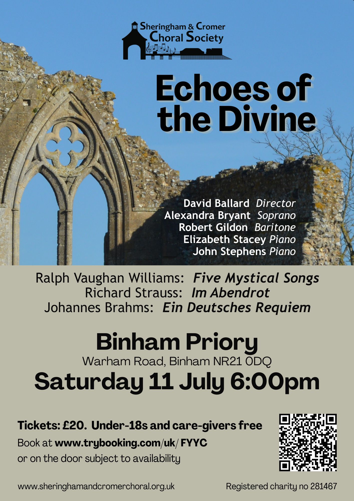 For our first ever concert in Binham Priory on Saturday 11 July at 6:00 pm the choir, directed by David Ballard, will perform Johannes Brahms’ Ein Deutches Requiem, Im Abendrot by Richard Strauss and Ralph Vaughan Williams’ Five Mystical Songs.