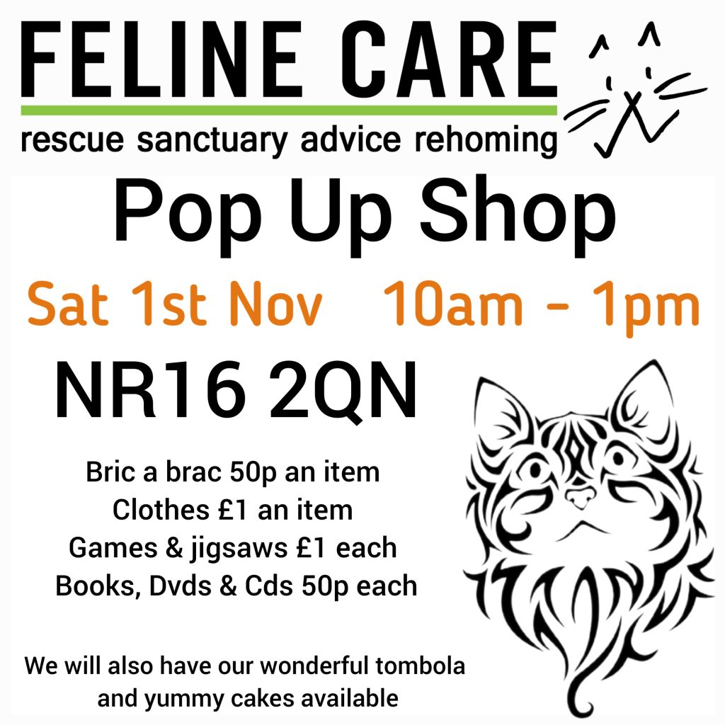 Pop Up Shop in the car park at Feline Care Cat Rescue, NR16 2QN, Saturday 1st November 10am – 1pm