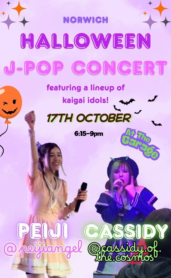 Come to the first Halloween J-pop concert night in Norwich! Featuring a lineup of kaigai idols – idols outside of Japan – including Peiji and Cassidy, you can see your favourite idol Halloween songs performed live! There will be singing and dancing to J-pop idol, vocaloid and anime songs to get you into the spooky season!